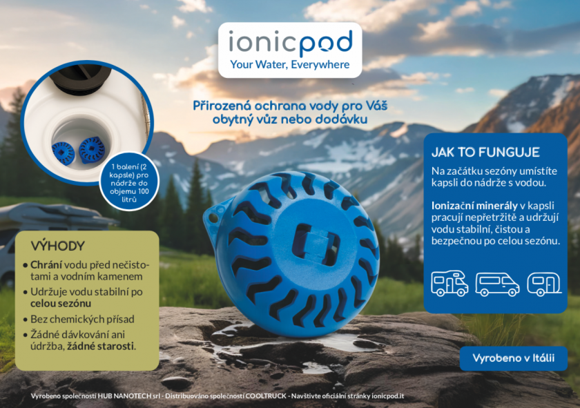 IONICPOD je inovativní kapsle, která udržuje kvalitu vody v nádrži Vašeho obytného vozu nebo dodávky po celou sezónu. Díky stříbrným solím a ionizovaným minerálům zalitých v potravinářské pryskyřici, působí přirozeně a nepřetržitě a zabraňuje vzniku bakterií, vodního kamene, nepříjemného zápachu i nečistot.